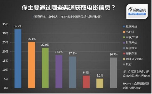 影院是仅次于社交网络的第二大渠道,占比为25.3%。在此之外,有22%的用户通过电视或广播获取电影资讯,另外还有17.3%的用户通过亲朋好友了解影片信息。