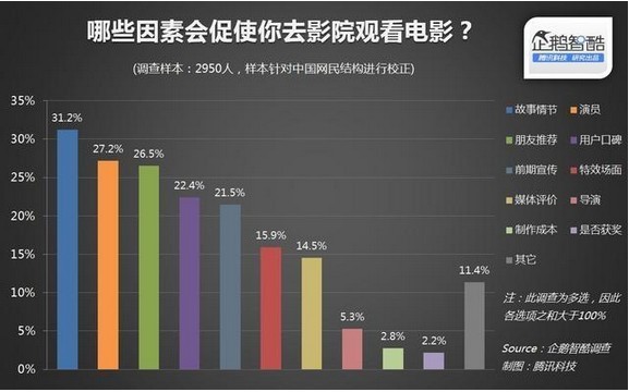 故事情节是促使用户走进影院观影的最主要因素。演员和熟人推荐同样能够让他们走进影院促进因素,二者的比例分别为27.2%和26.5%。用户口碑和前期宣传是第三类刺激因素,它们的影响力稍弱于前者。