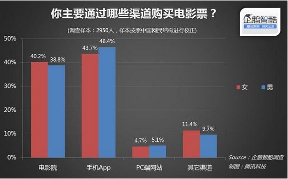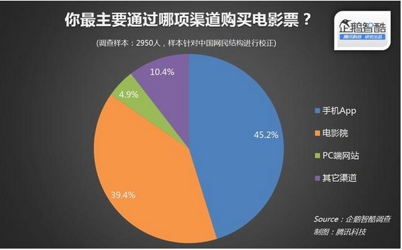 在移动互联网的推动下,手机App成功进化为用户购票的最主要渠道,超过45%的用户通过手机App购买电影票。作为对比,通过PC端网站购票的用户占4.9%,仅为手机App的九分之一。
