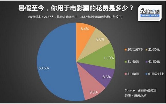 在今年暑假的观影用户中,超过50%用户的购票开支为60元以上,其它价位的比例则分布较为平均。